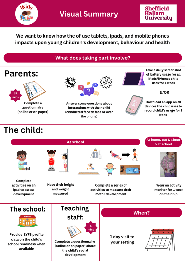 Below is a more detailed visual summary of what the study involves for parents, children and settings taking part. For a full information pack please click here.