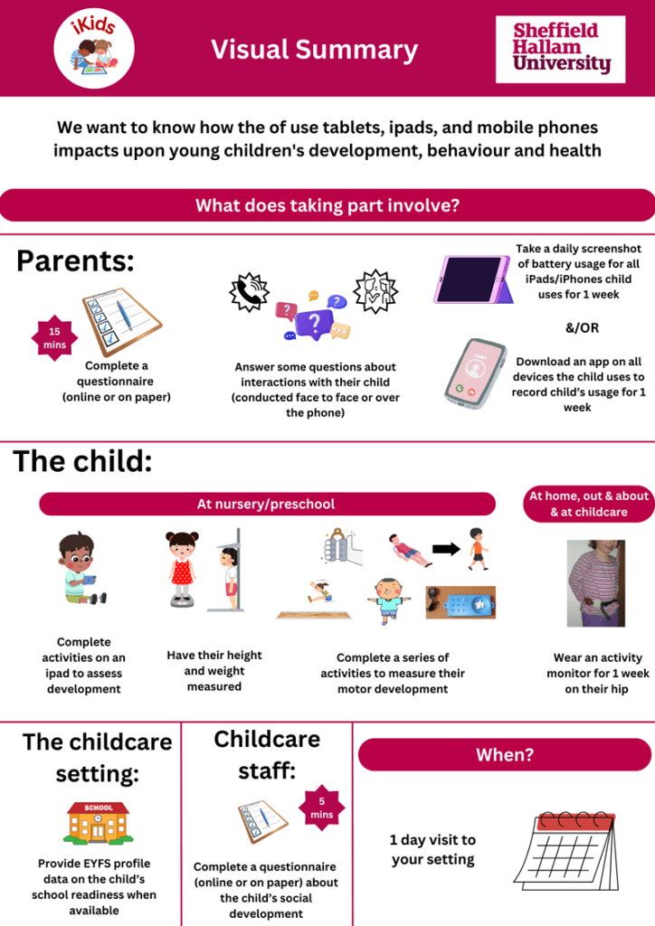 Below is a more detailed visual summary of what the study involves for parents, children and settings taking part. For a full information pack please click here.